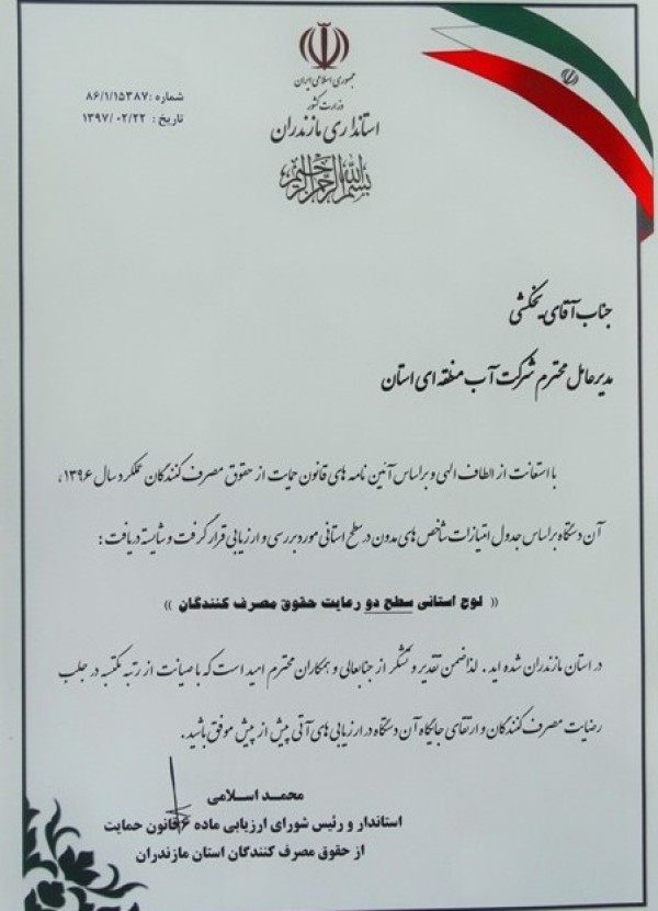 در این لوح استاندار مازندران ضمن اشاره به نحوه ارزیابی انجام شده از دستگاه اجرایی و اقتصادی استان، از جناب آقای دکتر محمد ابراهیم یخکشی مدیرعامل آب منطقه ای مازندران قدردانی و اظهار امیدواری نمود آن دستگاه در سالهای آتی نیز بتوانند در کسب رضایت مصرف کنندگان و دریافت کنندگان خدمات، رتبه و جایگاه برتر را کسب کند.