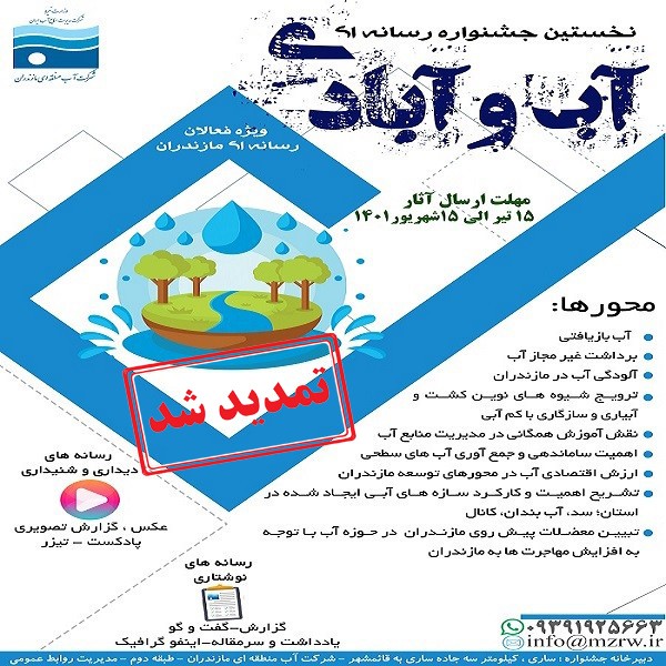 وی افزود: فراخوان این جشنواره 15 تیر امسال با هدف سوق دادن رسانهها و فعالان رسانهای استان به سمت تولید محتوای اثرگذار و مرتبط با اجزای مختلف مسائل پیرامون آب اعم از تأمین، مصرف، بهرهوری و ایجاد زیرساخت و شبکه آبی در مازندران منتشر شد و قرار بود آثاری که تا 15 شهریور تولید و منتشر شده باشند پذیرفته شوند. اما این بازه زمانی تا 15 مهر تمدید شده است.